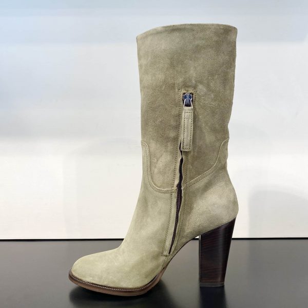 Tomaia esterna in camoscio. Tomaia interna in pelle. Suolettino interno in pelle. Suola esterna in cuoio con inserto in gomma antiscivolo. Zip lato interno, alta 20 cm. Altezza gambale 24 cm. Tacco alto 9,3 cm. Made in Italy.