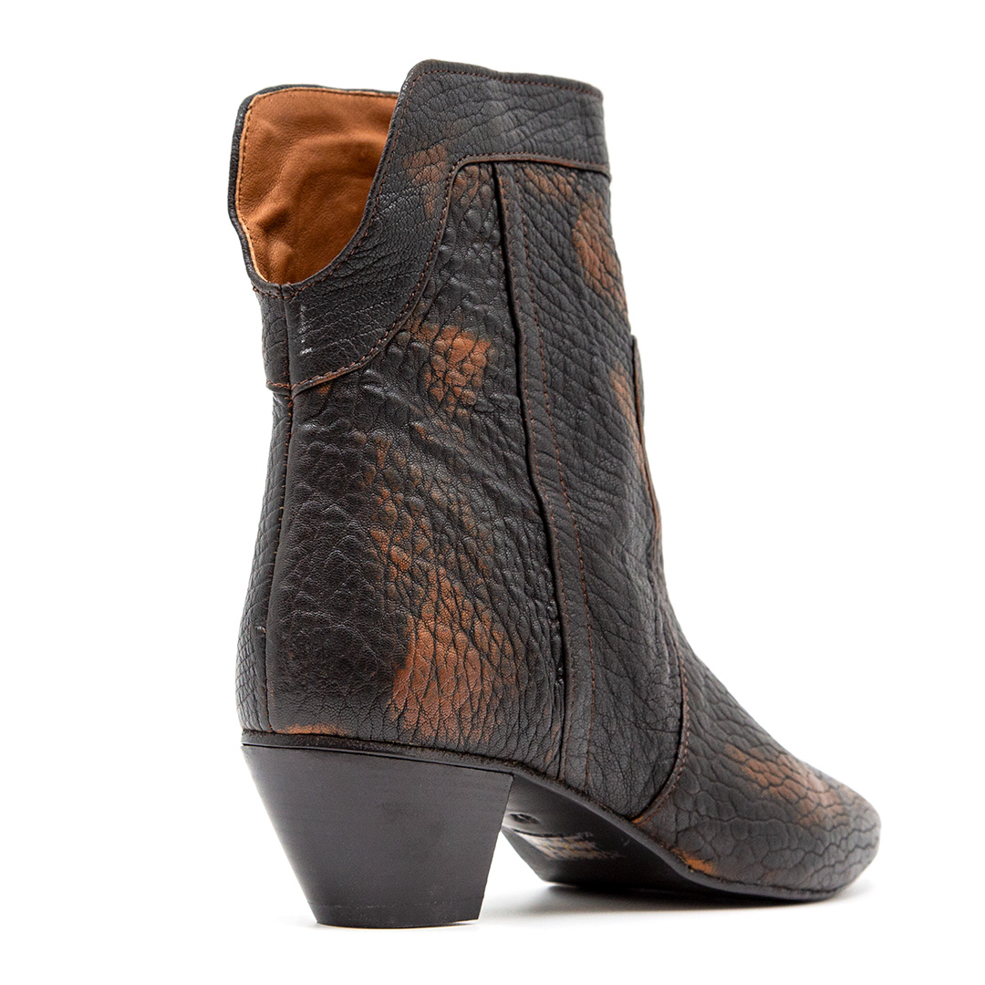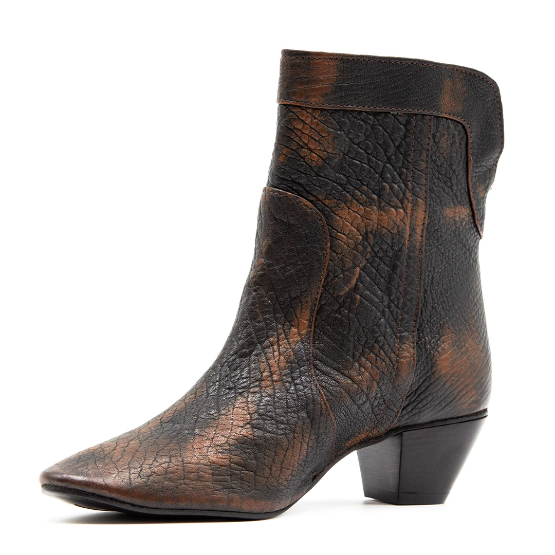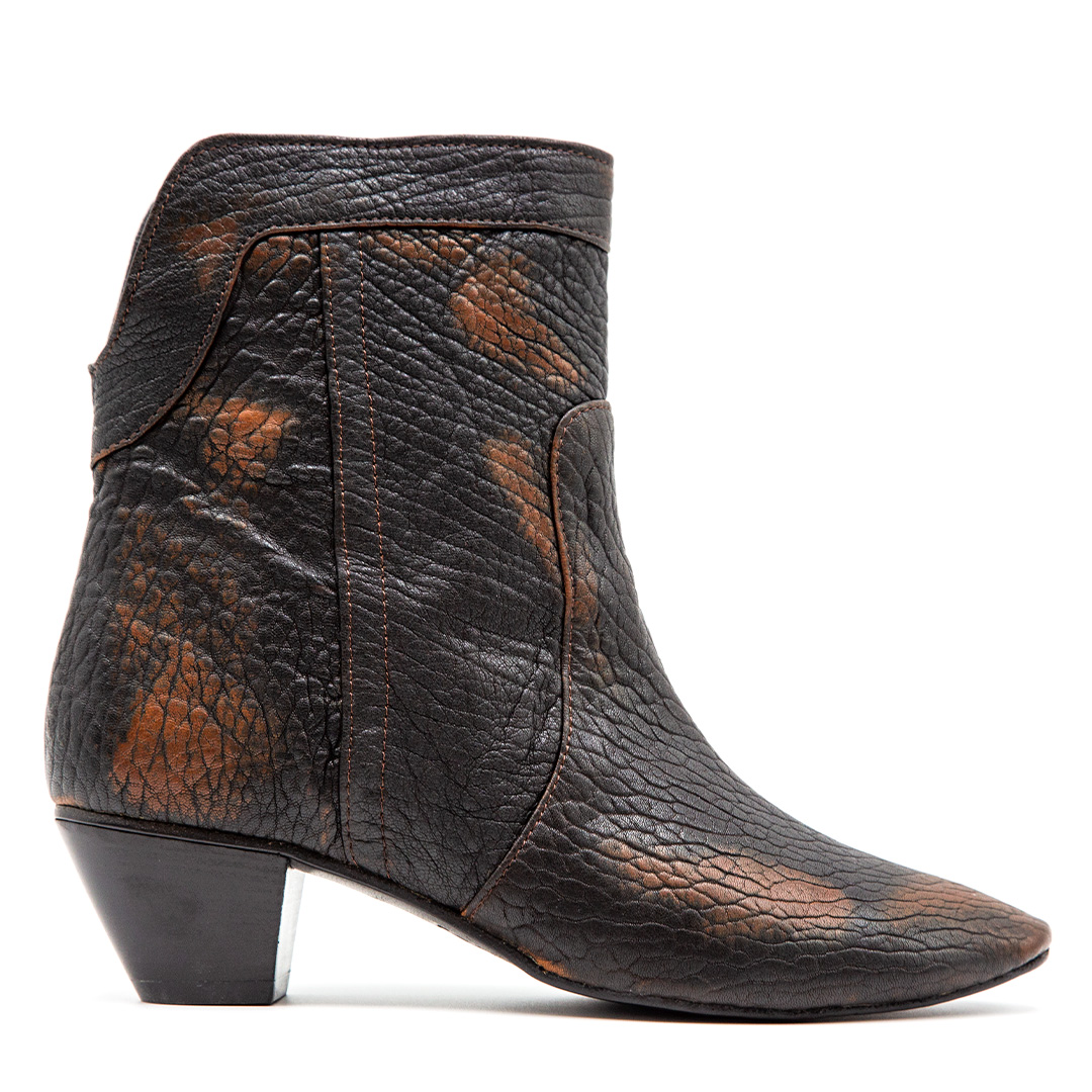 Stivaletto realizzato in morbida pelle goffrata di colore marrone e nero.