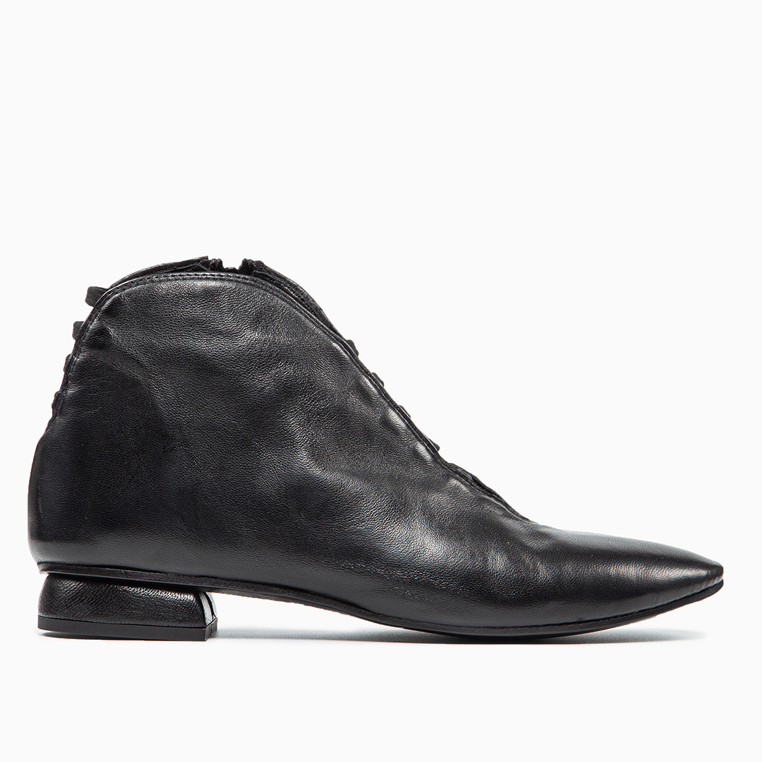 Stivaletto in morbida pelle nera. Dettaglio con elastici sulla tomaia e sul tallone. Suola e suolettino interno in pelle. Chiusura con cerniera laterale. Altezza tacco 2 cm. Produzione artigianale italiana.