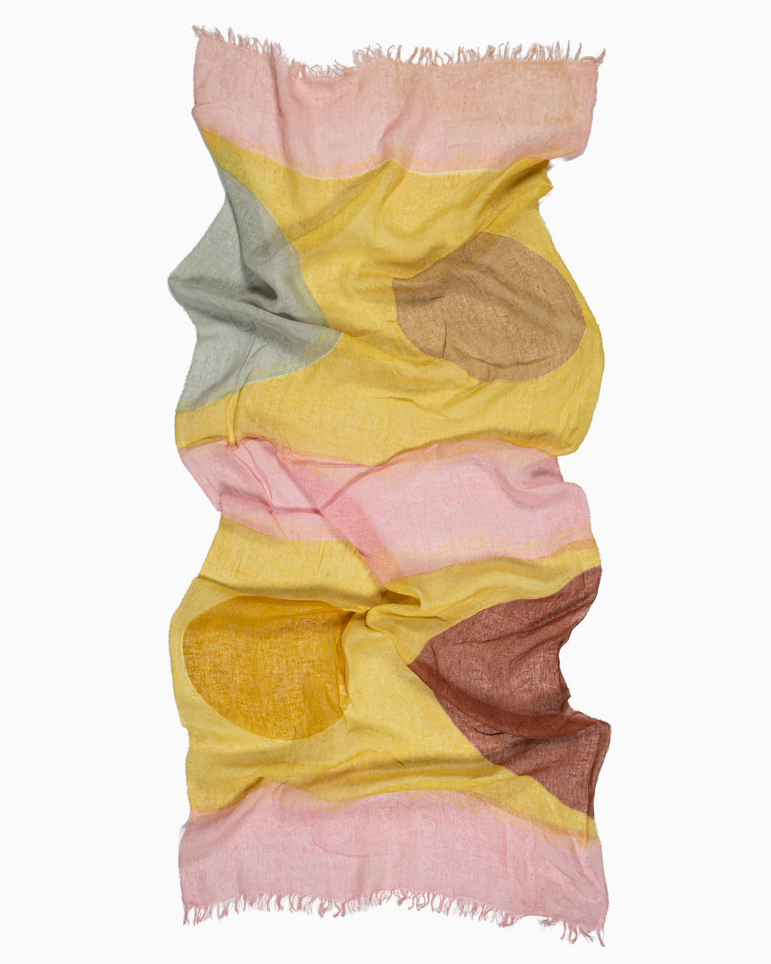 Sciarpa multicolor in lino dipinta a mano. Misure: 200X90. Materiale: 100% lino. Made in Italy.