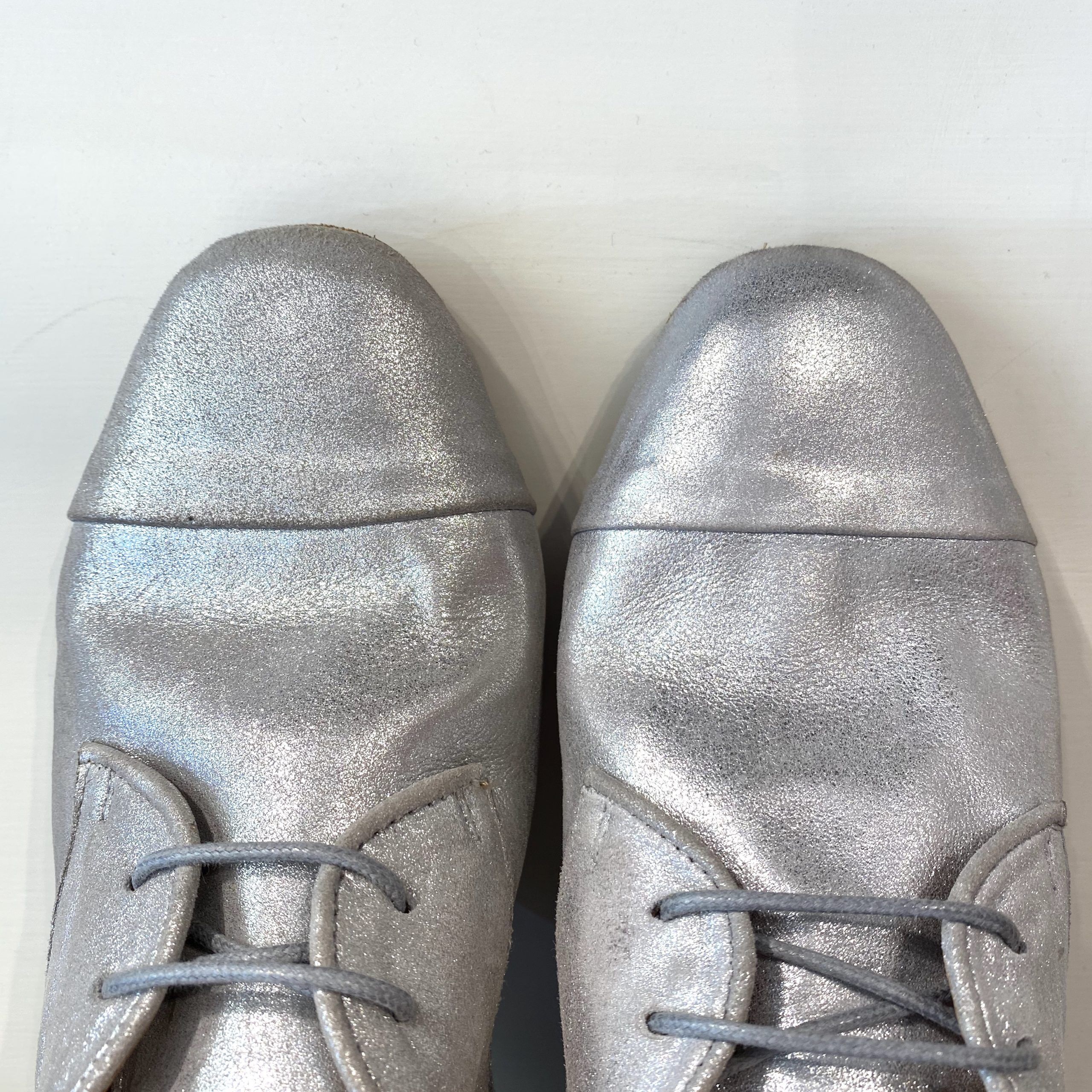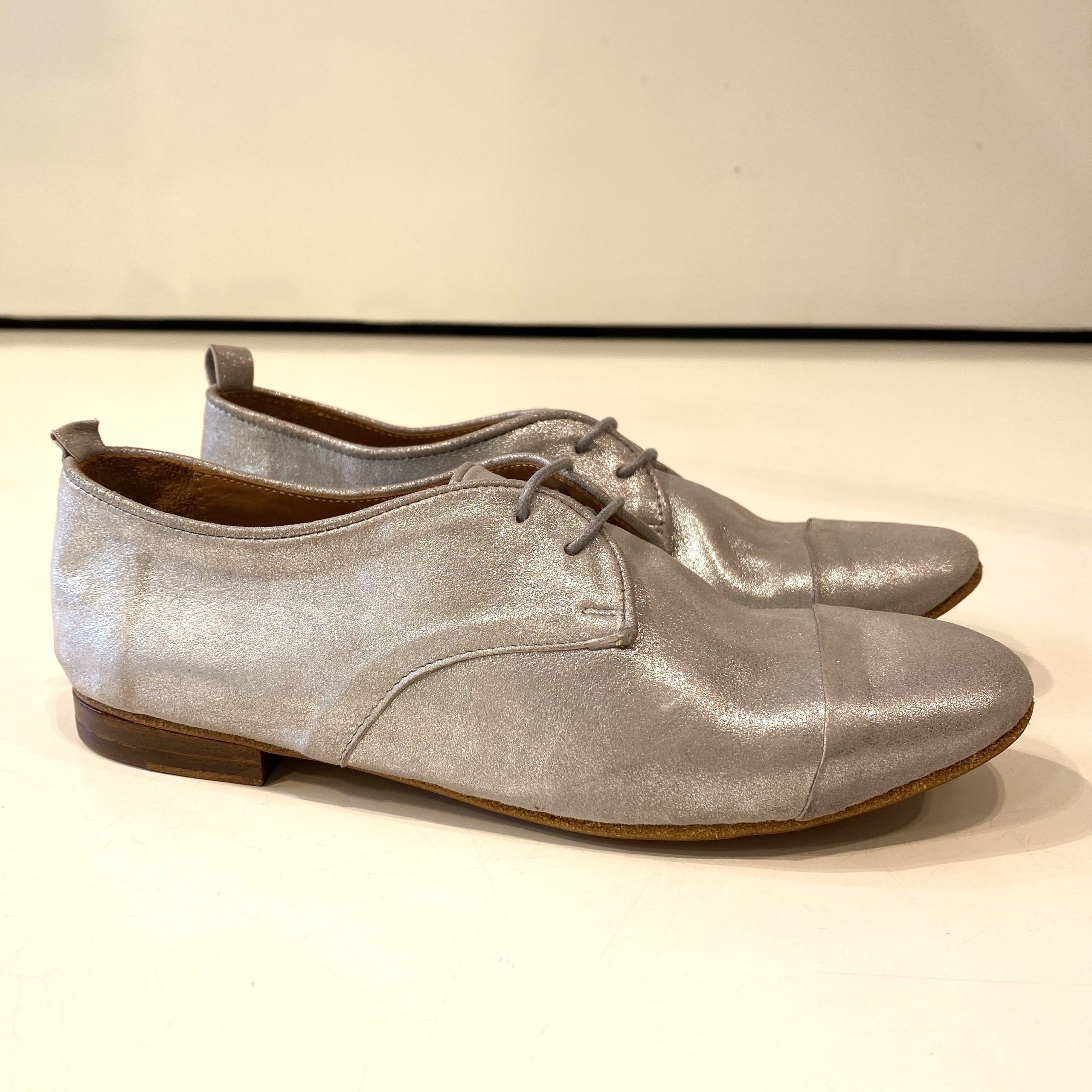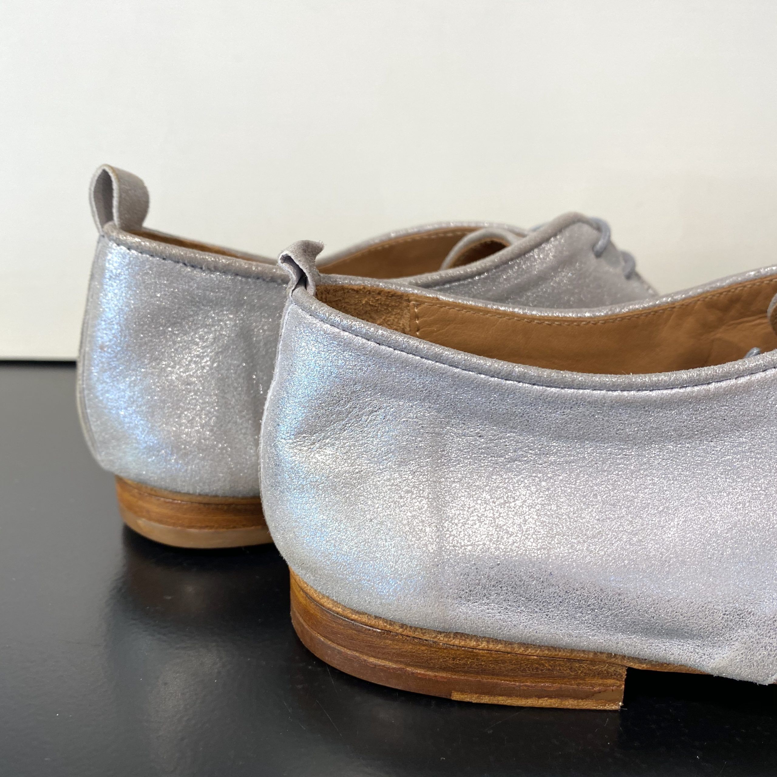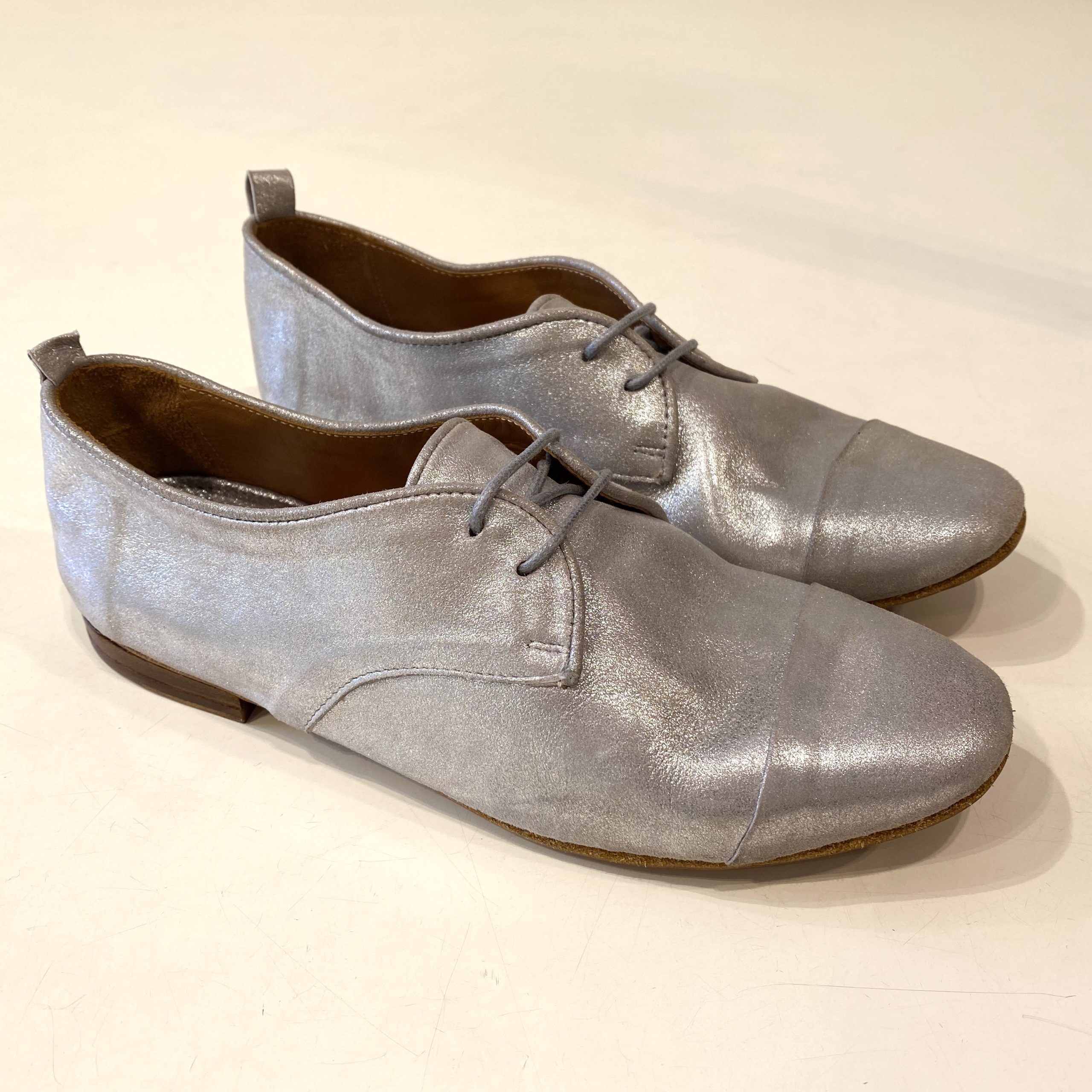 Tomaia interna ed esterna in pelle. Suolettino interno in pelle. Suola esterna in cuoio flessibile. Il tacco esterno con lo spessore interno misurano 2 cm in altezza. Calza piccolo quindi si consiglia il numero più grande.