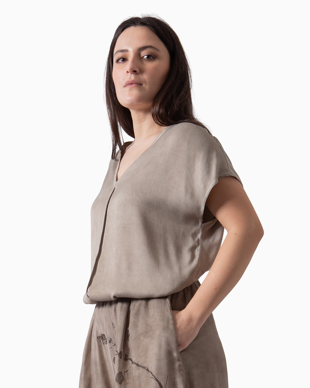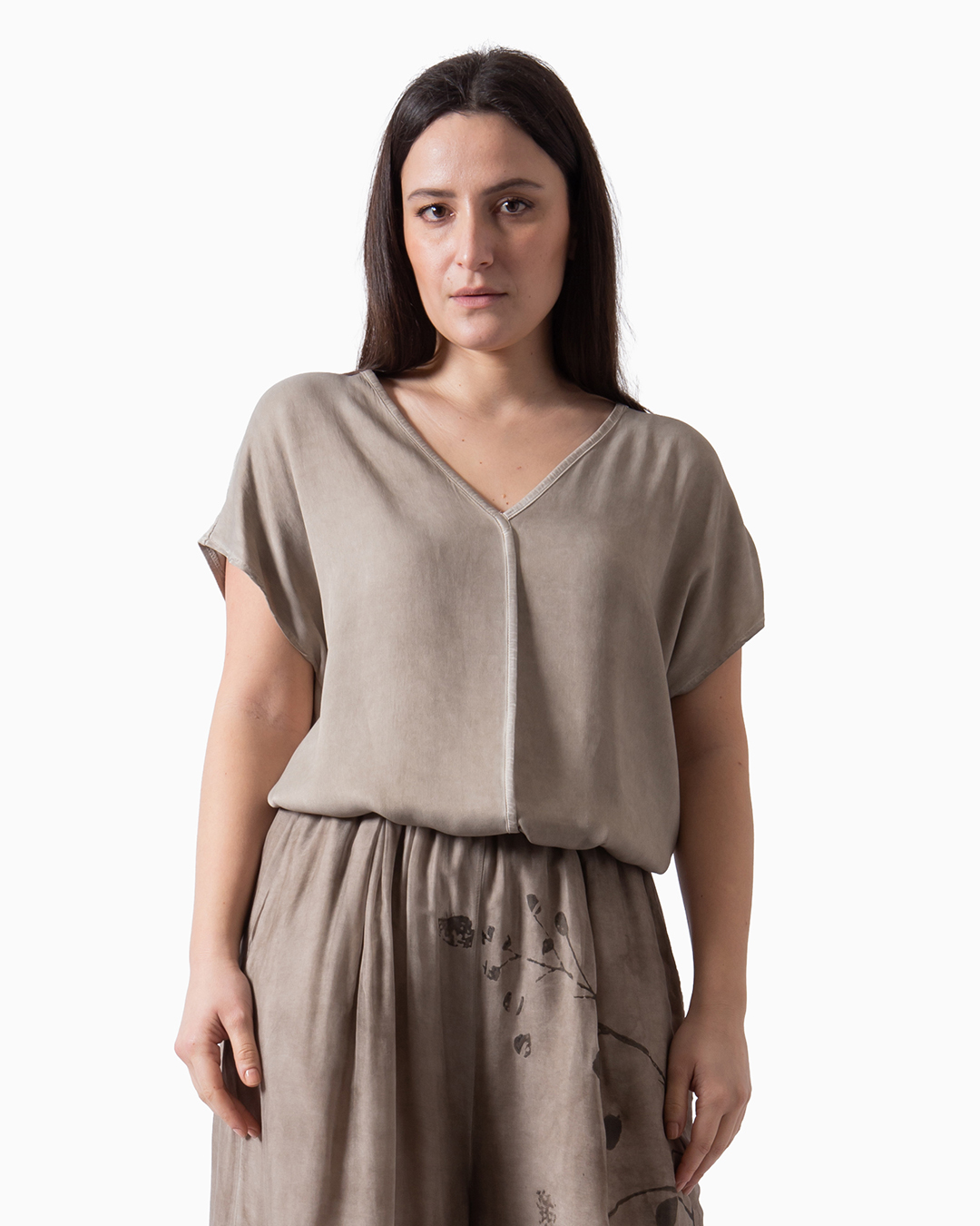 T-shirt con scollo a V in raso di viscosa davanti e jersey dietro. Dettaglio con taglio centrale. Fit morbido e lungo. Made in Italy.