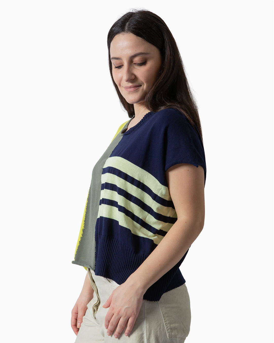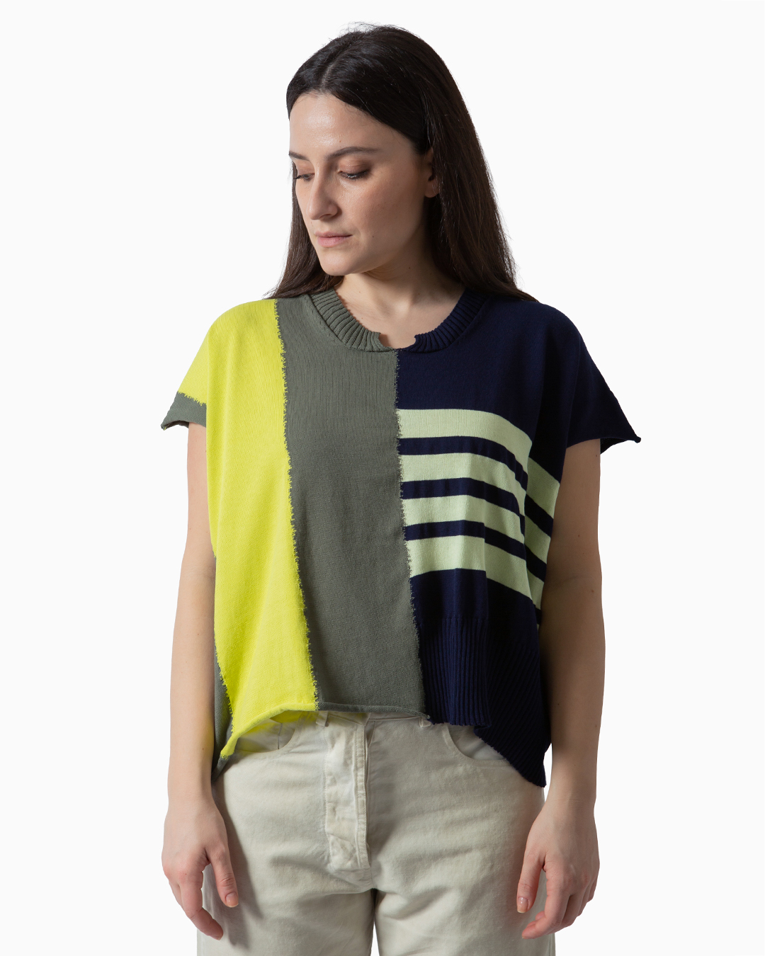 Top in maglia in cotone biologico. Comodo e dalla vestibilità ampia. Dettaglio fantasie a contrasto. Maglieria interamente realizzata in Italia.