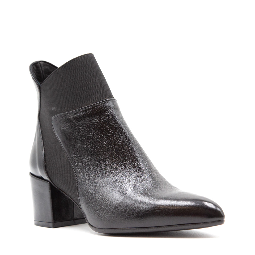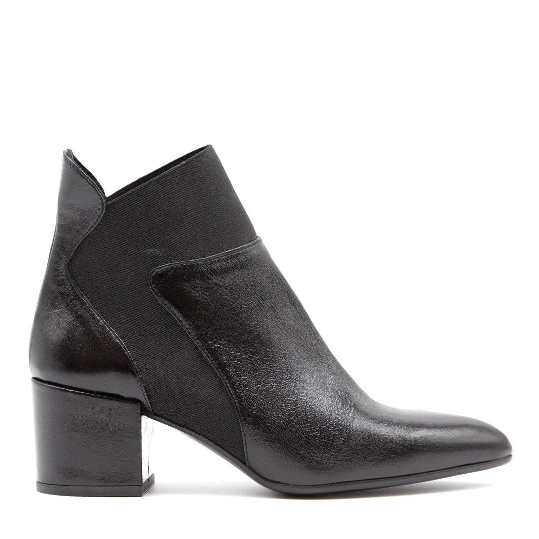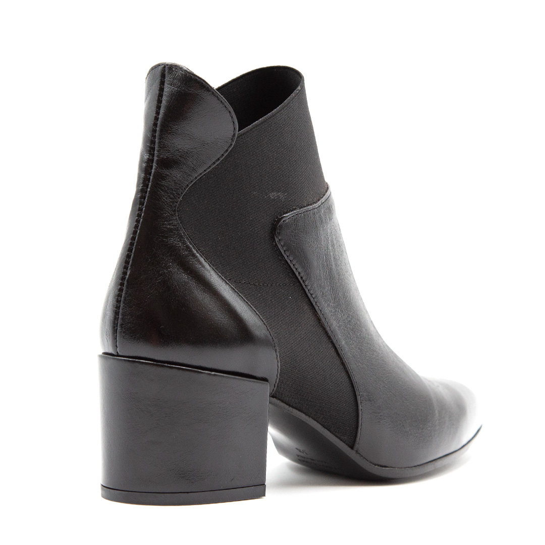Tronchetto in pelle nera con inserti elasticizzati.