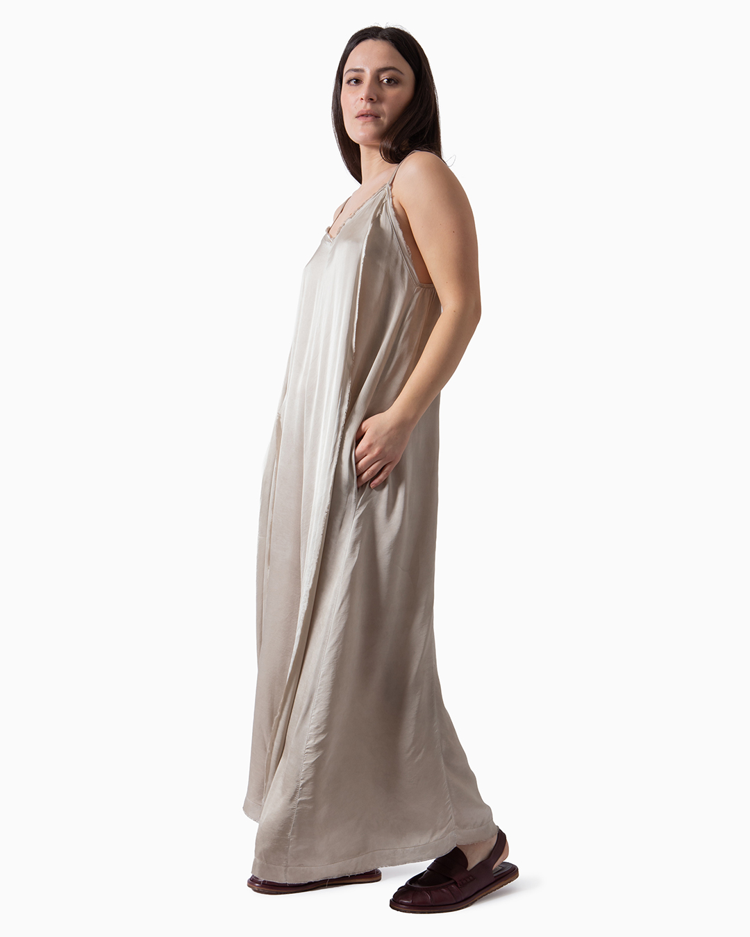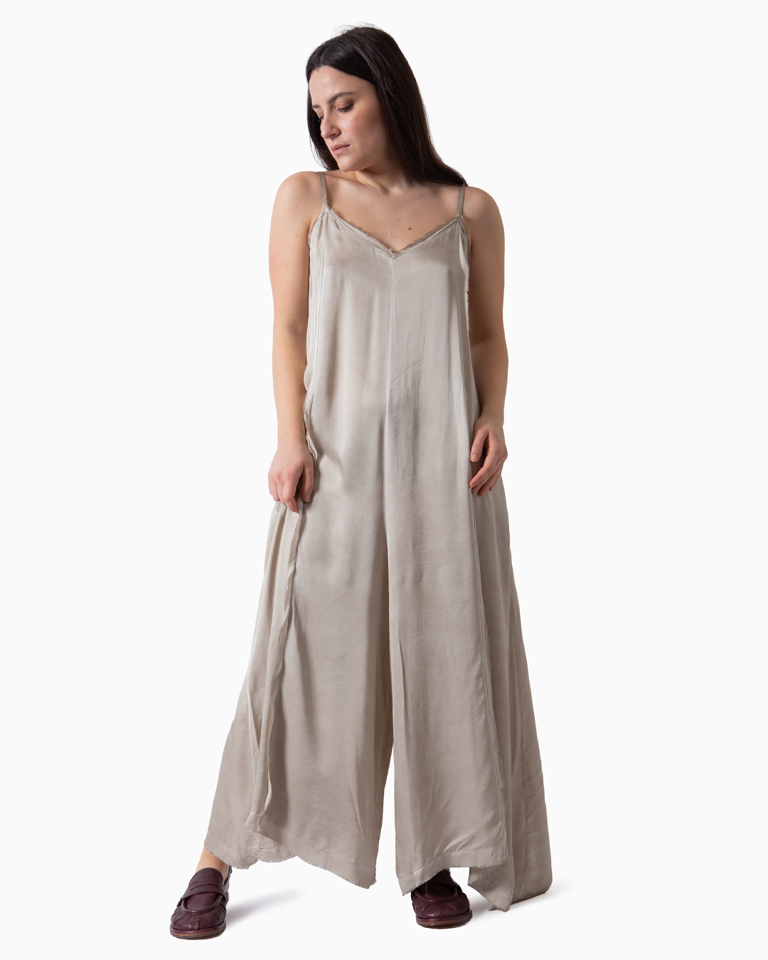 Tuta ampia a palazzo in raso di viscosa leggero. Spalline regolabili e tasche laterali. Composizione: 100% viscosa. Made in Italy.