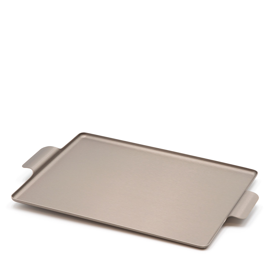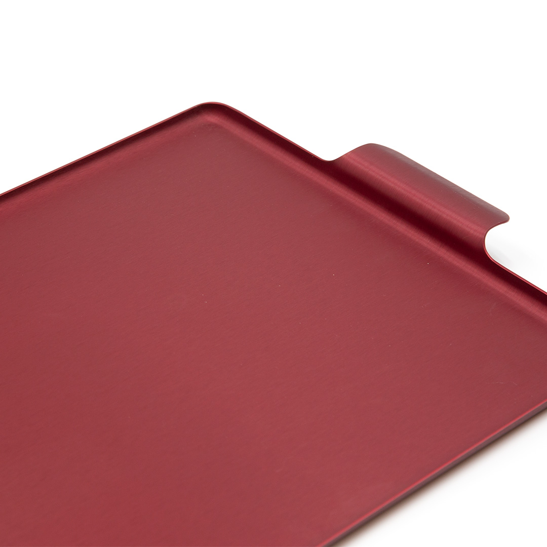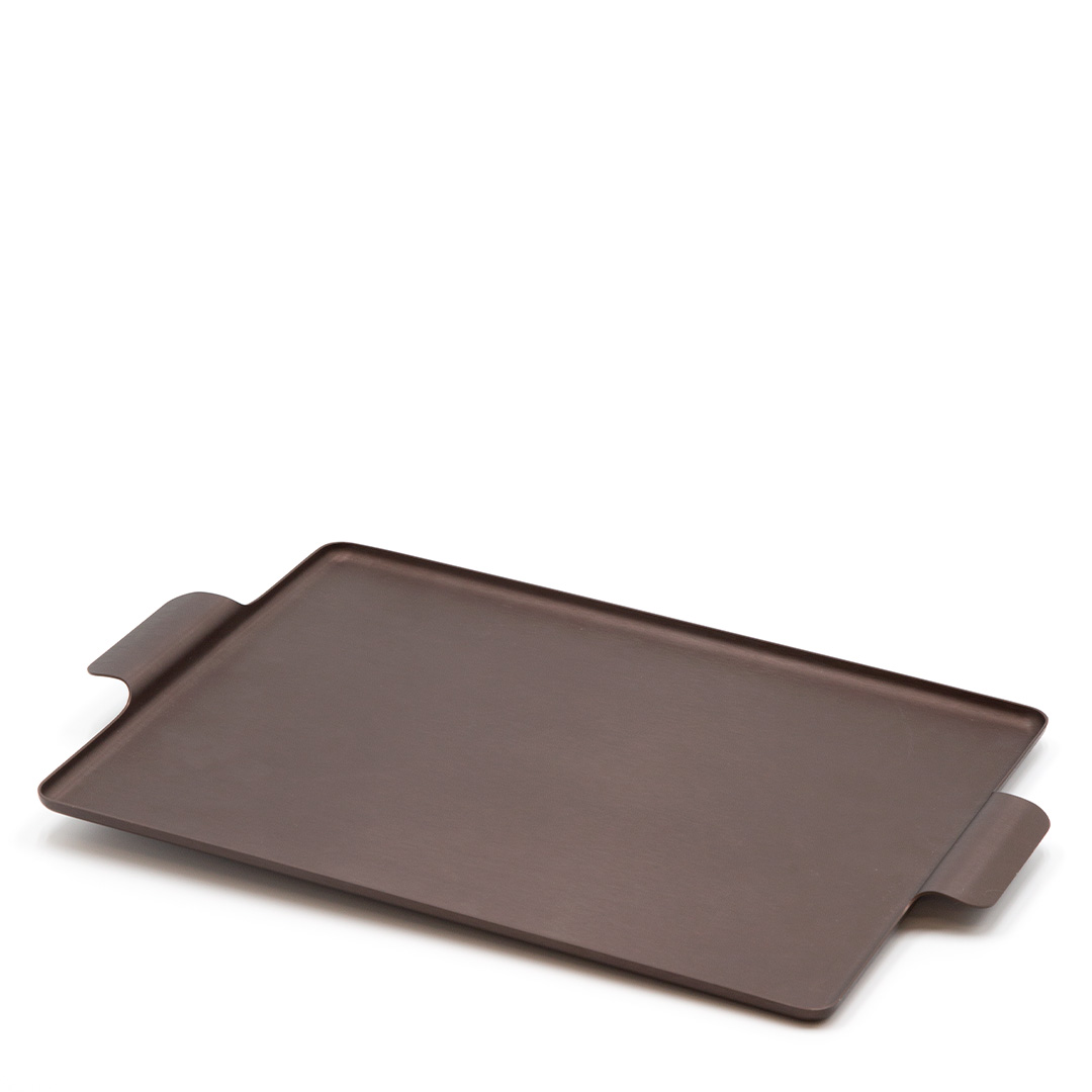 Vassoio leggero dal design contemporaneo e minimale in alluminio anodizzato, superfici spazzolate e rifinito a mano.